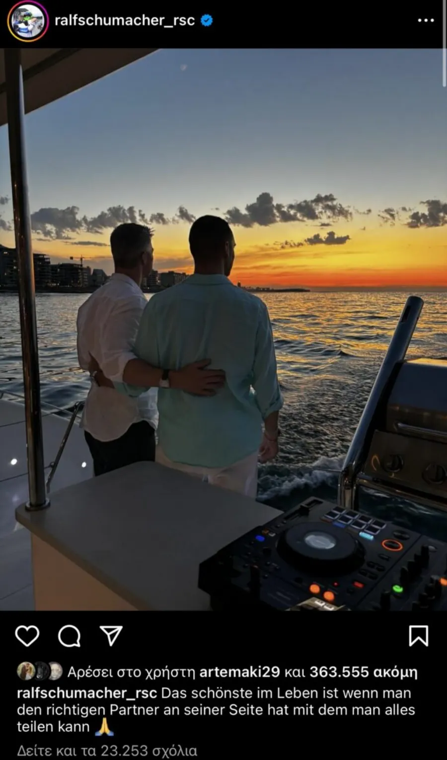 «Το πιο όμορφο πράγμα στη ζωή είναι όταν έχεις τον σωστό σύντροφο στο πλευρό σου με τον οποίο μπορείς να μοιραστείς τα πάντα» έγραψε ο Ραλφ Σουμάχερ στη λεζάντα της φωτογραφίας.
