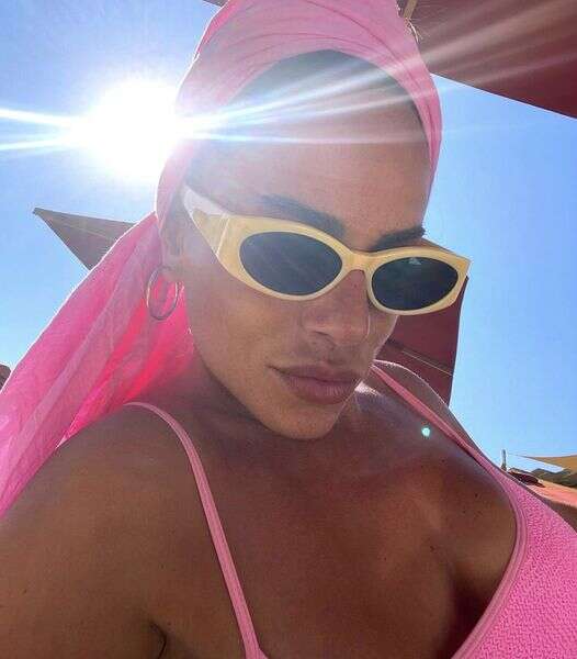 Με ροζ ολόσωμο και ίδιο χρώμα μαντήλι στα μαλλιά βλέπουμε τη Μαρία Αντωνά να χαλαρώνει σε ξαπλώστρα της Μυκόνου απολαμβάνοντας το κρασί της.