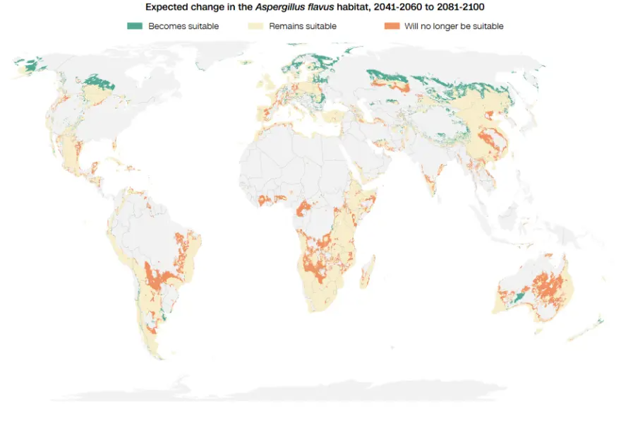 Το Aspergillus flavus, που προτιμά τα θερμά, τροπικά κλίματα, θα μπορούσε να αυξήσει την εξάπλωσή του κατά 16% εάν συνεχιστεί η υψηλή κατανάλωση ορυκτών καυσίμων. Αναμένεται να επεκταθεί σε βόρεια Κίνα, Ρωσία και ΗΠΑ. Είναι ιδιαίτερα ανθεκτικό σε φαρμακευτικές αγωγές και προσβάλλει και καλλιέργειες, απειλώντας την παγκόσμια επισιτιστική ασφάλεια. Το 2022, ο ΠΟΥ το κατέταξε στην «κρίσιμη» κατηγορία μυκητιακών παθογόνων.