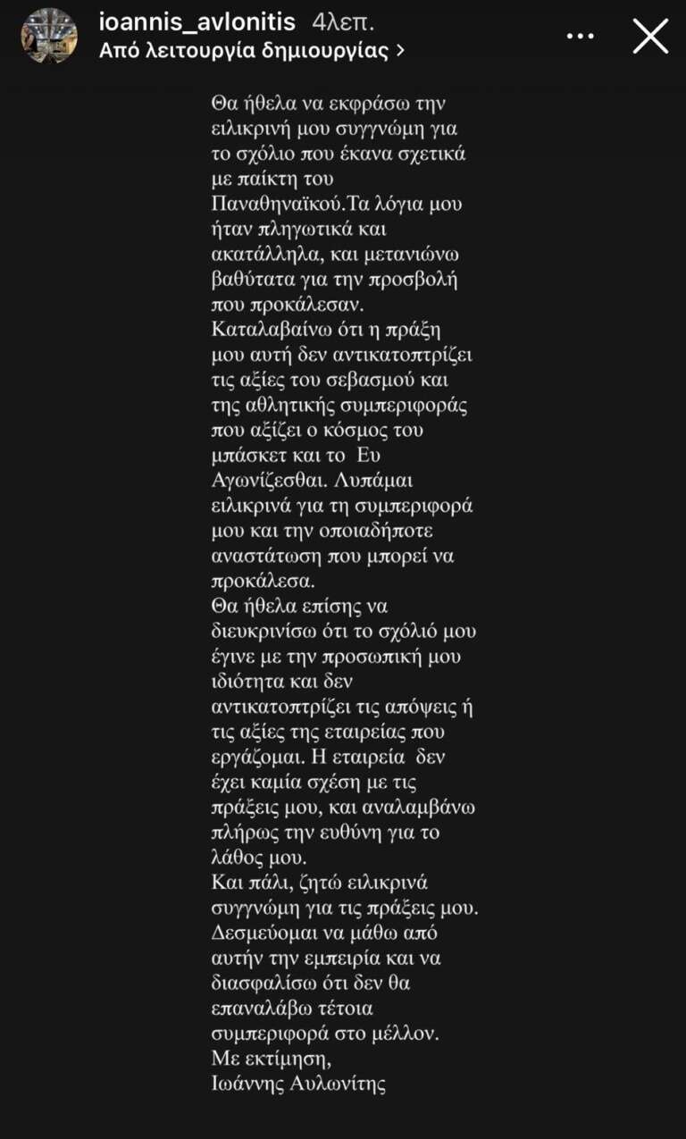 Ο Ιωάννης Αυλωνίτης, ο οποίος εργάζεται ως μάγειρας σε εστιατόριο των βορείων προαστίων, προέβη σε ένα εμετικό και χυδαίο σχόλιο για τον Κώστα Σλούκα, ευχόμενος σοβαρό τραυματισμό του MVP του Final Four. Φυσικά, αυτό δεν πέρασε απαρατήρητο.