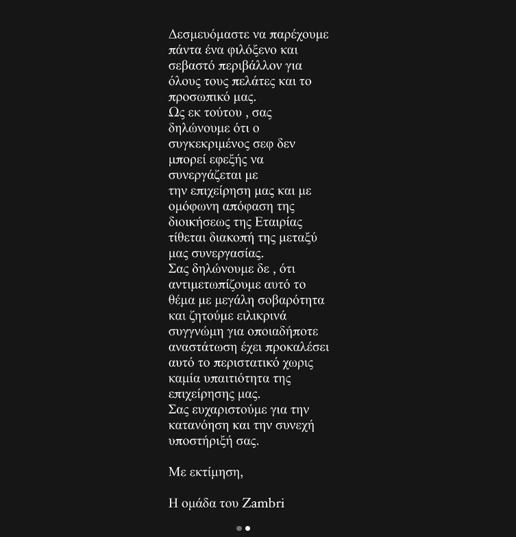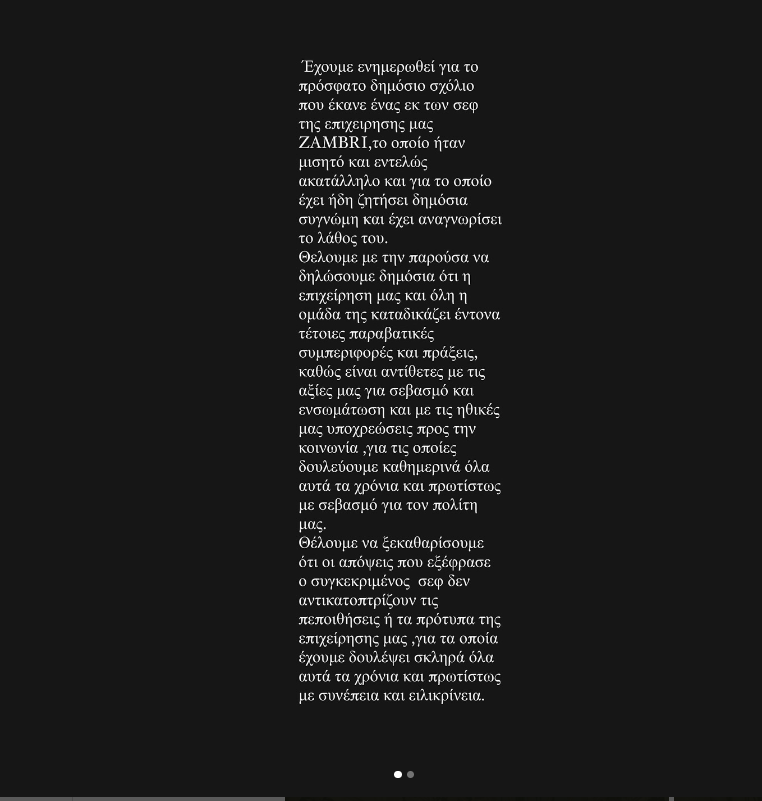 «Έχουμε ενημερωθεί για το πρόσφατο δημόσιο σχόλιο που έκανε ένας εκ των σεφ της επιχείρησης μας ZAMBRI, το οποίο ήταν μισητό και εντελώς ακατάλληλο και για το οποίο έχει ήδη ζητήσει δημόσια συγνώμη και έχει αναγνωρίσει το λάθος του.