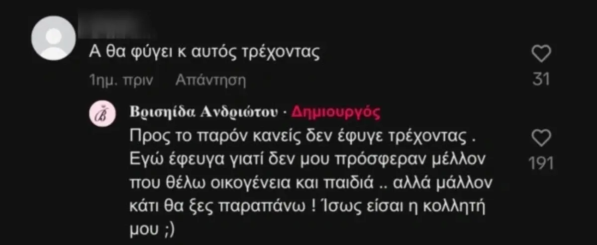 Η αντίδραση της Βρισηίδας Ανδριώτου ήρθε άμεσα και ήταν… ευθύβολη: «Προς το παρόν κανείς δεν έφυγε τρέχοντας. Εγώ έφευγα γιατί δεν μου πρόσφεραν μέλλον που θέλω, οικογένεια και παιδιά… αλλά μάλλον κάτι θα ξες παραπάνω! Ίσως είσαι η κολλητή μου», απάντησε.