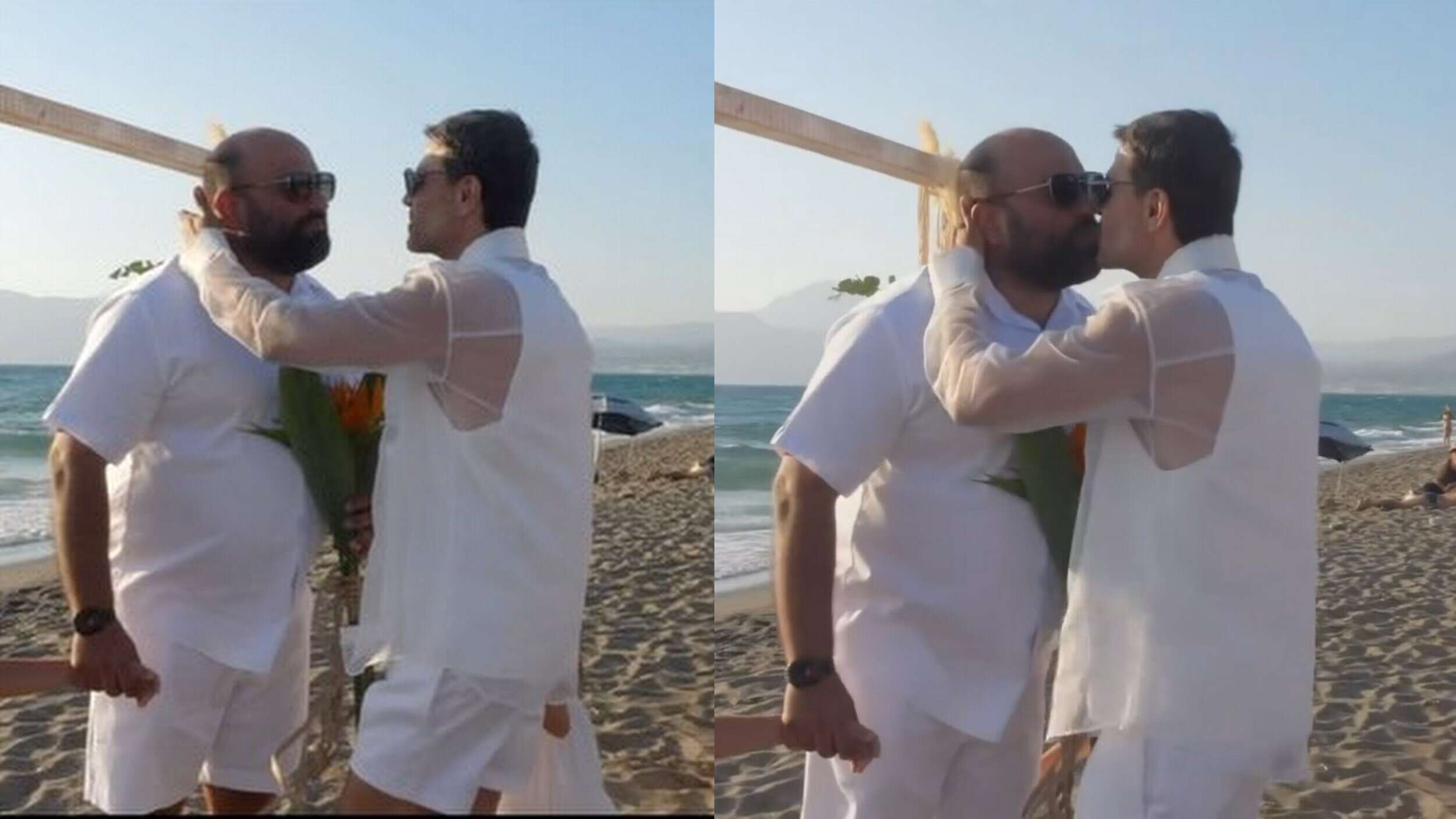 Σε κλίμα συγκίνησης πραγματοποιήθηκε ο γάμος του Παντελή Τουτουντζή με τον επί 18 χρόνια σύντροφό του, Νάσο, με μια ρομαντική τελετή στα Μάταλα της Κρήτης.