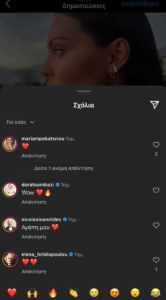 «Θεά», σημείωσε η Σάσα Σταμάτη, ενώ η Μαρία Μπεκατώρου αρκέστηκε σε ένα emoji σε σχήμα κόκκινης καρδιάς.