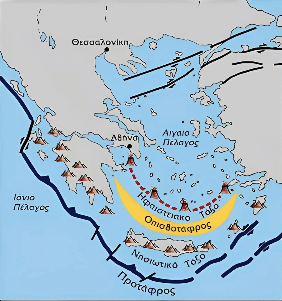 «Κυρίως το εξωτερικό ελληνικό τόξο, από την Κεφαλονιά και νότια της Πελοποννήσου, καταμήκος των ακτών της Κρήτης και από την Κάρπαθο έως τη Ρόδο. Μετά η τάφρος του βορείου Αιγαίου.