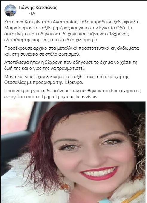 Μοιραίο ήταν το ταξίδι μητέρας και γιου στην Εγνατία Οδό. Το αυτοκίνητο που οδηγούσε η 52χρονη και επέβαινε ο 18χρονος, εξετράπη της πορείας του στο 57ο χιλιόμετρο.