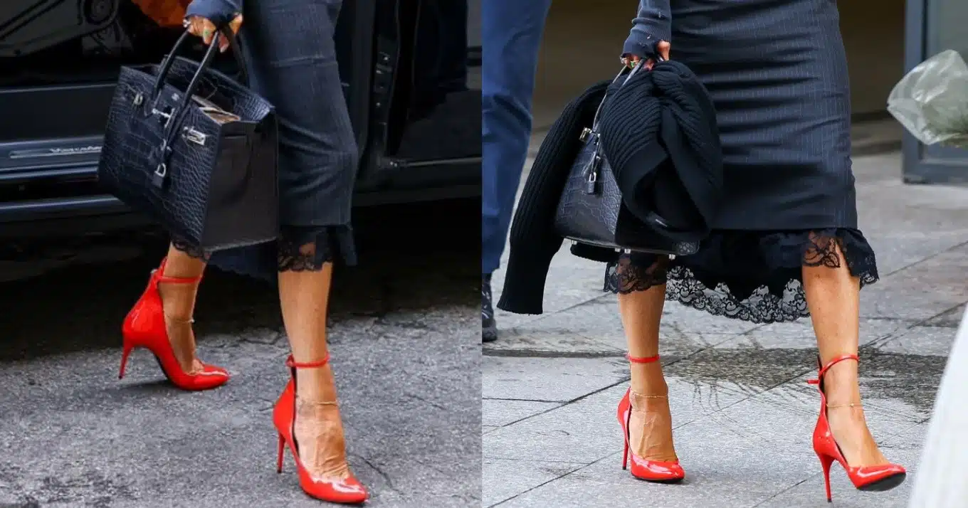 Ειδικότερα, η σύζυγος του Ντέιβιντ Μπέκαμ φόρεσε ένα φθαρμένο μακρυμάνικο τοπ Balenciaga, με λαιμόκοψη στολισμένη με δαντέλα και το συνδύασε με μια σκούρα γκρι φούστα με ρίγες και δαντελένιο φινίρισμα στο στρίφωμα, από τη συλλογή Καλοκαίρι 2024 τoυ ίδιου οίκου, ένα ζευγάρι πανύψηλες λουστρινένιες κόκκινες γόβες, που είχα δύο λεπτεπίλεπτα λουράκια με αλυσίδα στους αστραγάλους από τον Alaïa, μια Hermès Birkin Sellier 25 από μαύρο ματ δέρμα αλιγάτορα, η οποία κοστίζει 82.500 δολάρια και ένα ζευγάρι μεγάλα μαύρα γυαλιά ηλίου από τη δική της σειρά.
