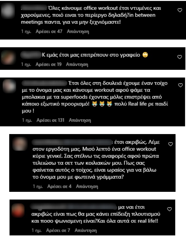 Οι γυναίκες followers της δεν πήραν με καλό μάτι αυτό το ποστ, καθώς φαντάστηκαν τι θα γινόταν, αν οι ίδιες άρχιζαν να κάνουν γυμναστική στο γραφείο όπου εργάζονται.