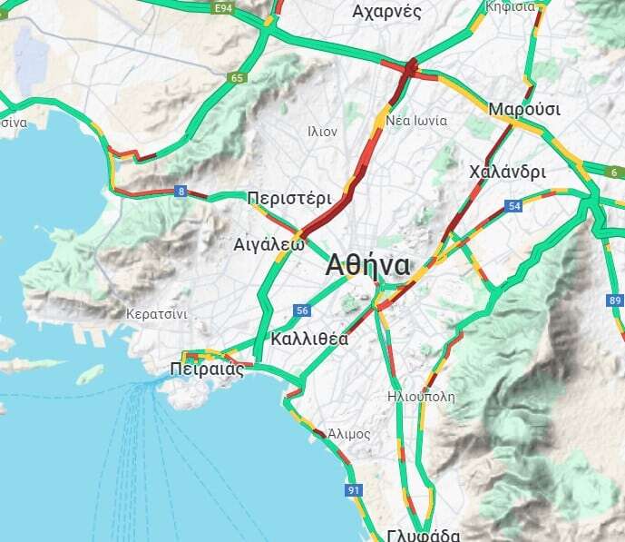 Τα σημαντικότερα προβλήματα εντοπίζονται στον Κηφισό. Στο ρεύμα προς Πειραιά τα οχήματα κινούνται με αργούς ρυθμούς από τη Λυκόβρυση μέχρι το Αιγάλεω και στην άνοδο από τα ΚΤΕΛ μέχρι τη Νέα Φιλαδέλφεια.