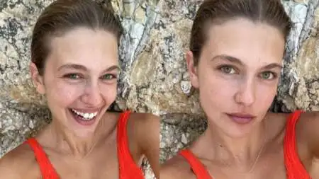 Η ηθοποιός ποζάρει χαμογελαστή στην κάμερα του κινητού της χωρίς ίχνος μακιγιάζ φορώντας ένα ολόσωμο πορτοκαλί μαγιό.
