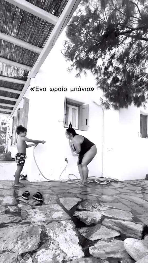 «Αποφασίσαμε με τον Ίωνα να κάνουμε μπάνιο με το λάστιχο έξω αντί για την ντουζιέρα. Όταν ήμουν μικρή, στις διακοπές ήταν σχεδόν «κανονικότητα» το μπάνιο στην αυλή ή στις ταβέρνες με λάστιχα αν ήμασταν σερί έξω, ή στον κήπο της γιαγιάς μου, ή ακόμα κι αν δεν είχαμε πάει θάλασσα πάλι το τολμούσαμε.