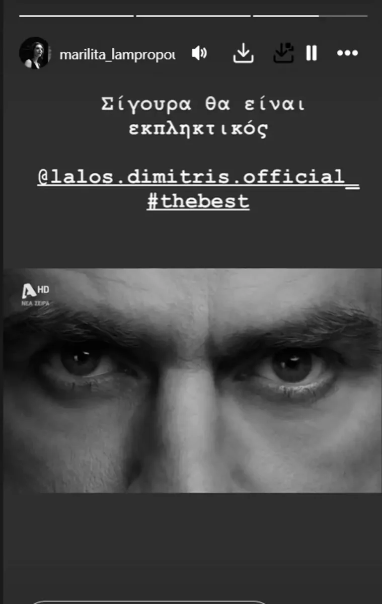 Η Μαριλίτα Λαμπροπούλου μοιράστηκε το teaser της νέας σειράς στα social media, δείχνοντας έτσι τη στήριξή της για τον πρώην συμπρωταγωνιστή της. Η αγαπημένη ηθοποιός, η οποία φαίνεται πως θαυμάζει πολύ τον Δημήτρη Λάλο έγραψε «Σίγουρα θα είναι καταπληκτικός».