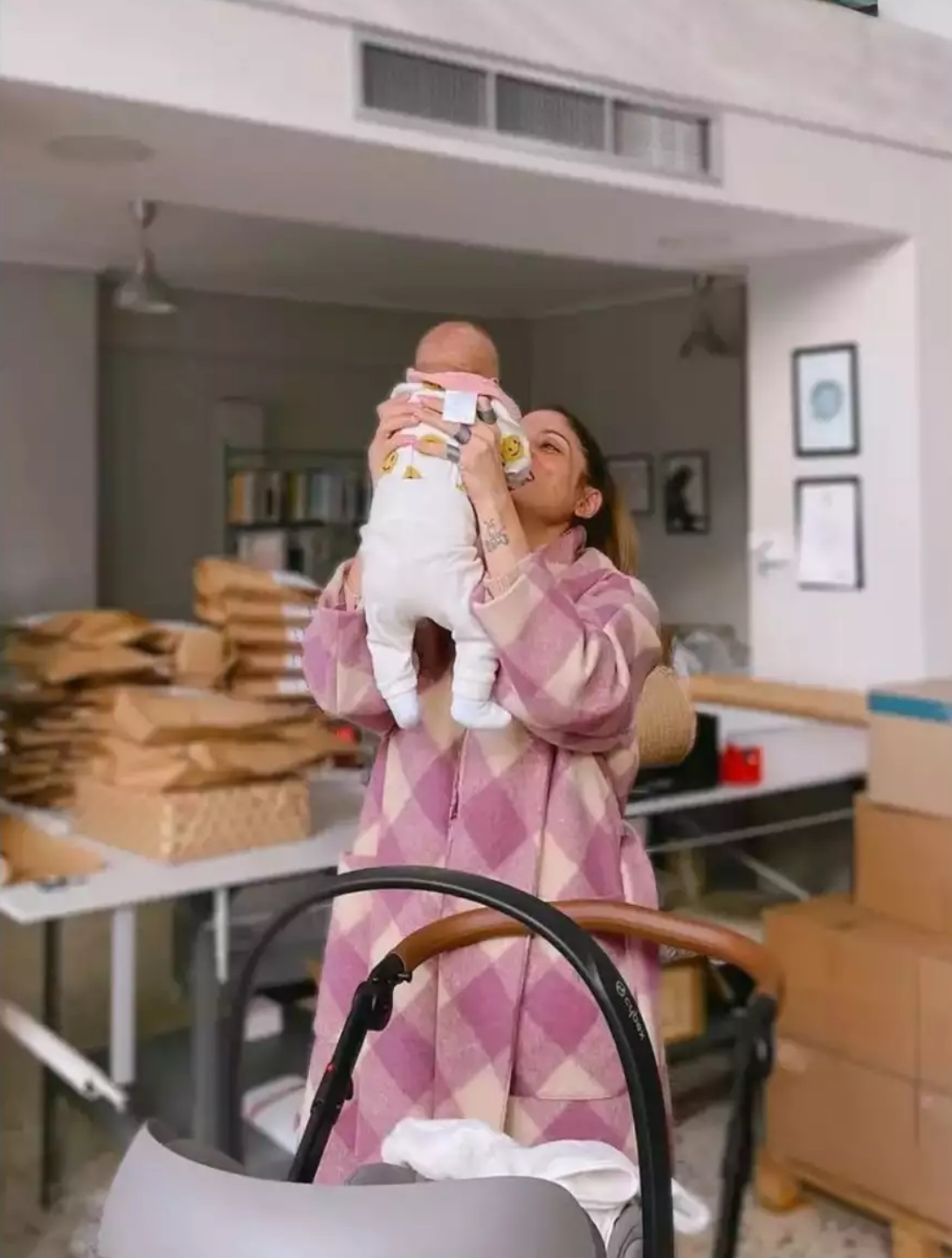 «Έχουν υπάρξει άπειρες στιγμές όπως αυτό στην φωτογραφία: με το μωρό αγκαλιά να προσπαθώ να δουλεύω είτε από το σπίτι, είτε στον υπολογιστή, είτε στο γραφείο, είτε στην φωτογράφηση για την καινούργια μας παλέτα Χριστοπουλάκι έχει τον έλεγχο σε όλα!!!! Ps.: δείτε πως μου κρατάει το χέρι», είχε γράψει στην ανάρτησή της η Ανίτα Μπραντ.
