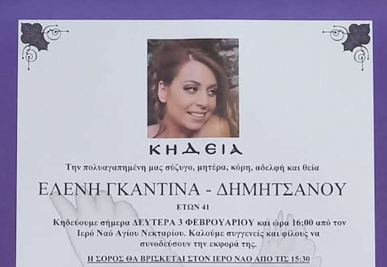Σε ηλικία 41 ετών έφυγε από τη ζωή η Ελένη Γκαντίνα-Δημητσάνου, αφήνοντας πίσω τον σύζυγό της και τα δύο της παιδιά.