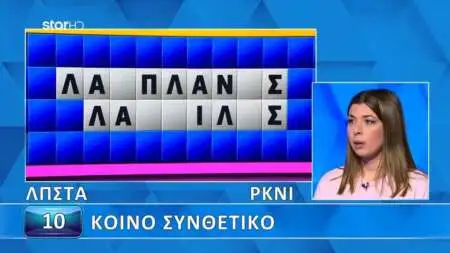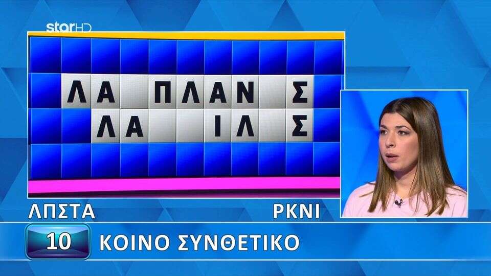 Η κατηγορία ήταν «Συνώνυμα», όπως ανακοίνωσε η Νατάσα Κουβελά, ενώ στον πίνακα αποκαλύφθηκαν τα γράμματα Λ, Π, Σ, Τ και Α. Στη συνέχεια, η Χριστίνα επέλεξε τα σύμφωνα Ρ, Κ, Ν και Γ, ενώ για φωνήεν διάλεξε το Η.