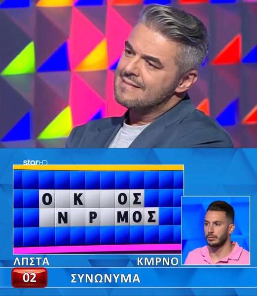 Ο Κωνσταντίνος κλήθηκε να λύσει τον γρίφο στην κατηγορία «Συνώνυμα», έχοντας αποκλείσει τα γράμματα «Λ,Π,Σ,Τ,Α», και μαντεύοντας το ένα μετά το άλλο σωστά τα «Κ,Μ,Ρ,Ν,Ο», με λιγοστά κενά να απομένουν.