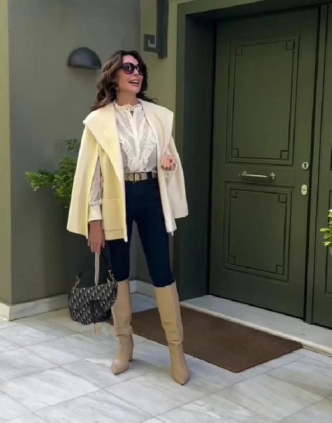 Μέσα από την κάπα της φόρεσε ένα πουκάμισο με βολάν σε ρομαντικό στιλ. Ολοκλήρωσε το look της με stretch jeans, που ανέδειξαν τα λεπτά πόδια της και ένα ζευγάρι ψηλές μπεζ μπότες μέχρι το γόνατο.