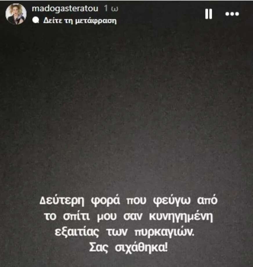 οργισμένη ανάρτηση της Μαντώς Γαστεράτου για τις φωτιές στην Αττική καθώς η ίδια αναγκάστηκε να εγκαταλείψει το σπίτι της.