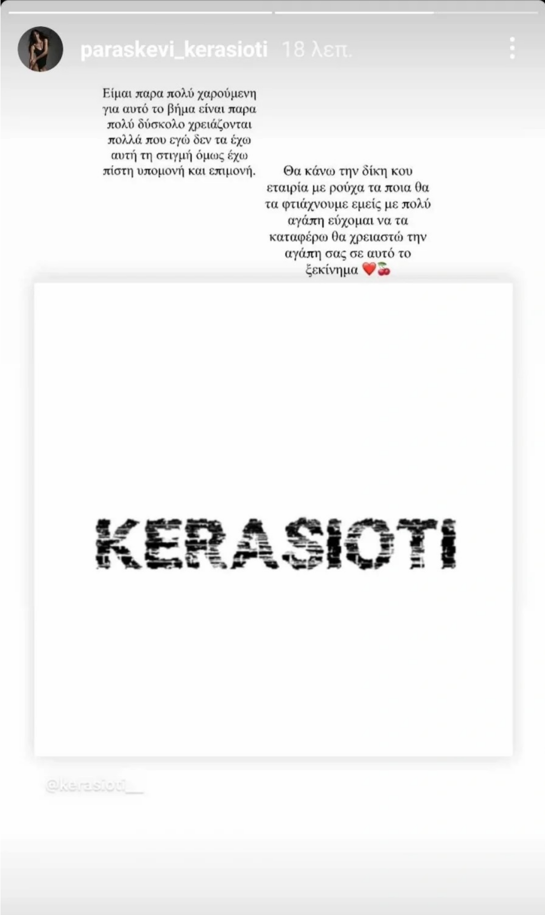«Είμαι πάρα πολύ χαρούμενη για αυτό το βήμα. Είναι πάρα πολύ δύσκολο. Χρειάζονται πολλά που εγώ δεν τα έχω αυτή την στιγμή, όμως έχω πίστη, υπομονή και επιμονή. Θα κάνω τη δική μου εταιρία με ρούχα τα ποια θα τα φτιάχνουμε εμείς με πολύ αγάπη. Εύχομαι να τα καταφέρω. Θα χρειαστώ την αγάπη σας σε αυτό το ξεκίνημα» έγραψε η ίδια στο story της.