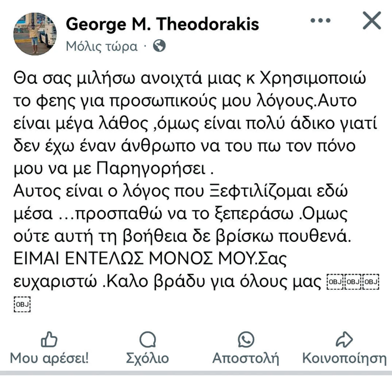Όπως υπογράμμισε ο γιος του Μίκη Θεοδοράκη σε ανάρτησή του στο Facebook, την περασμένη Παρασκευή, το βράδυ: «Θα σας μιλήσω ανοιχτά, μιας και χρησιμοποιώ το φέις (σ.σ.: facebook) για προσωπικούς μου λόγους. Αυτό είναι μέγα λάθος, όμως είναι πολύ άδικο, γιατί δεν έχω έναν άνθρωπο να του πω τον πόνο μου, να με παρηγορήσει. Αυτός είναι ο λόγος που ξεφτιλίζομαι εδώ μέσα… προσπαθώ να το ξεπεράσω. Όμως, ούτε αυτή τη βοήθεια δε βρίσκω πουθενά. ΕΙΜΑΙ ΕΝΤΕΛΩΣ ΜΟΝΟΣ ΜΟΥ. Σας ευχαριστώ. Καλό βράδυ για όλους μας» ήταν η πρώτη ανάρτηση που έκανε το βράδυ της περασμένης Παρασκευής.