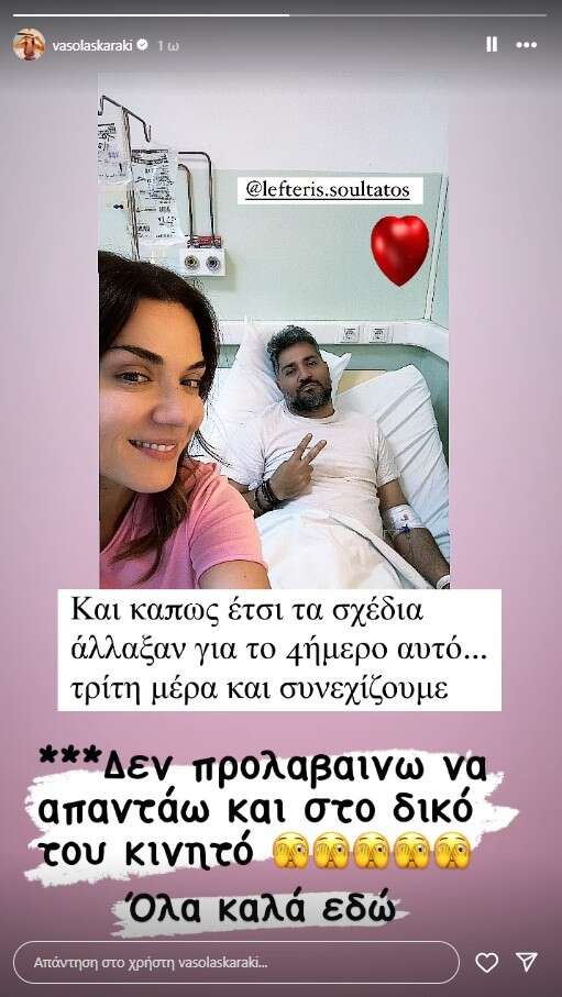 «Και κάπως έτσι τα σχέδια άλλαξαν για το 4ημερο αυτό. Τρίτη μέρα και συνεχίζουμε. Δεν προλαβαίνω να απαντάω και στο δικό του κινητό. Όλα καλά εδώ», έγραψε η Βάσω Λασκαράκη, η οποία ανέβασε μια φωτογραφία με τον Λευτέρη Σουλτάτο, μέσα από το δωμάτιο του νοσοκομείου, με την ίδια πρόσφατα να πραγματοποιεί μια ιδιαίτερη εξομολόγηση.