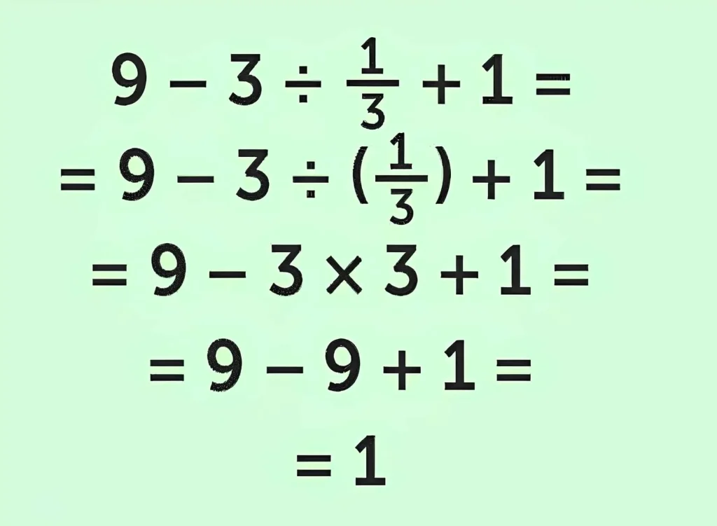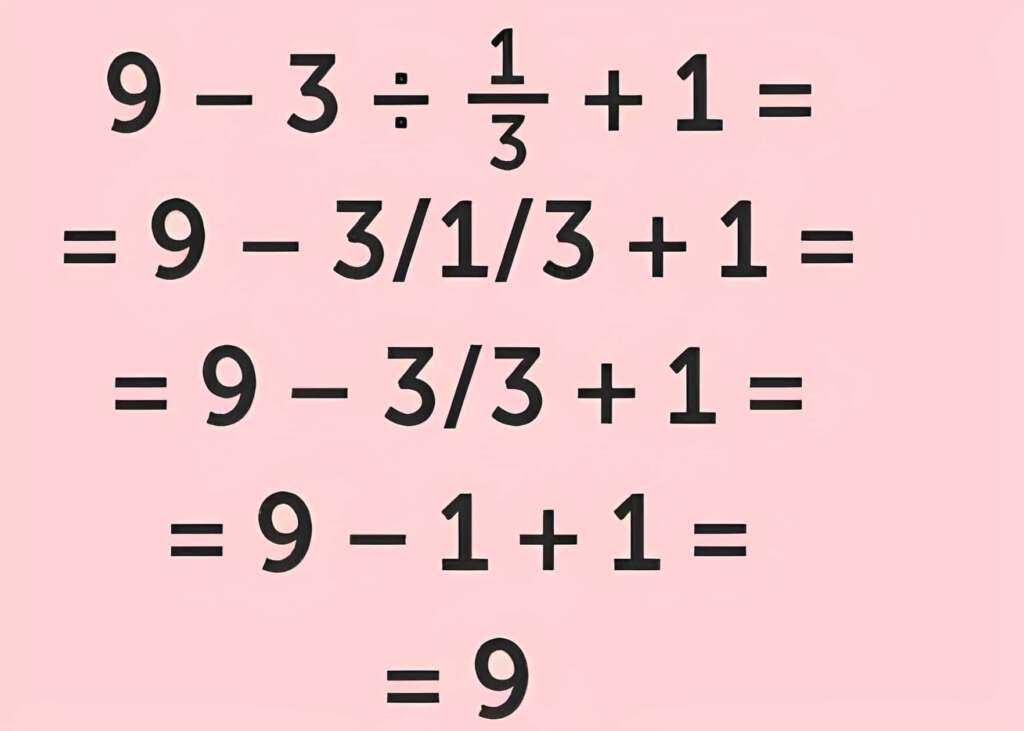 – Η διαίρεση και τα κλάσματα στην ουσία είναι οι ίδιες πράξεις. Έτσι, μπορούμε να το δούμε ως εξής: 3/1/3, όπου το κλάσμα αντιστρέφεται και γίνεται: 3*3/1 και η διαίρεση γίνεται πολλαπλασιασμός. Καταφέρατε να βρείτε τη σωστή λύση; Μοιραστείτε αυτό το μαθηματικό πρόβλημα με τους φίλους σας για να τους βάλετε σε σκέψεις!