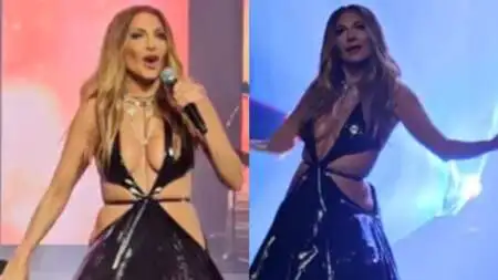 Η τραγουδίστρια εμφανίστηκε στη σκηνή με ένα μαύρο βινύλ μακρύ φόρεμα, που διέθετε βαθύ ντεκολτέ και ανοίγματα στα πλάγια του σώματος της. Ενώ, ξεκάθαρη ήταν η απάντηση του Βασίλη Μπισμπίκη όταν ρωτήθηκε για το ενδεχόμενο γάμου με την αγαπημένη του Δέσποινα Βανδή.