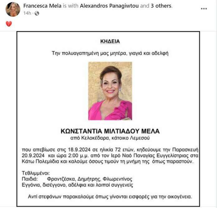 Με μια κόκκινη, ραγισμένη καρδιά, ανακοίνωσε στα σόσιαλ της χθες βράδυ η Φραντζέσκα Μελά, πως η αγαπημένη της μητέρα κηδεύεται αύριο 20/9, στα Κάτω Πολεμίδια.