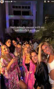Στα στιγμιότυπα που ανάρτησε μέσω Instagram stories, η Κόνι Μεταξά ανέβασε αρχικά μία φωτογραφία με τις φίλες της, από τη στιγμή που διασκεδάζουν στο μαγαζί, δείχνοντας την εμφάνισή της. Έχοντας ρόλει στα μαλλιά πόζαρε, τόσο με την παρέα της, όσο και με τον σύζυγό της και την τούρτα γενεθλίων του.