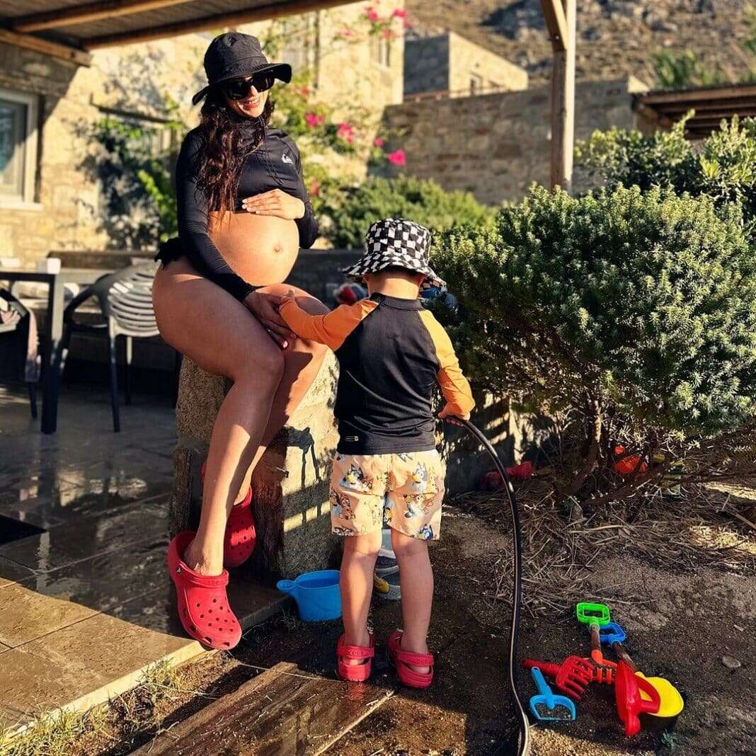 Το χαρμόσυνο γεγονός αποκάλυψε η ίδια η ηθοποιός, δημοσιεύοντας φωτογραφίες με φουσκωμένη κοιλίτσα από τις καλοκαιρινές διακοπές της. Στην πρώτη, η Ευαγγελία Συριοπούλου ποζάρει με τον γιο της, ο οποίος είναι περίπου 3 ετών.