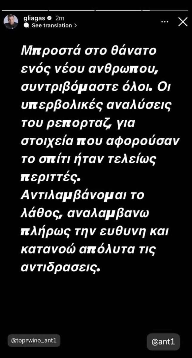 Αναλυτικότερα, ο Γιώργος Λιάγκας αναφέρει στην ανάρτησή του: “Μπροστά στον θάνατο ενός νέου ανθρώπου συντριβόμαστε όλοι.