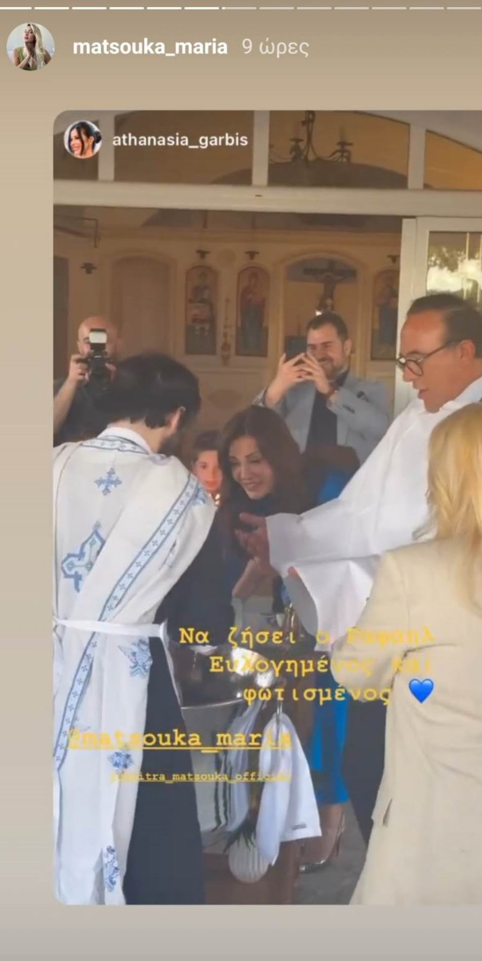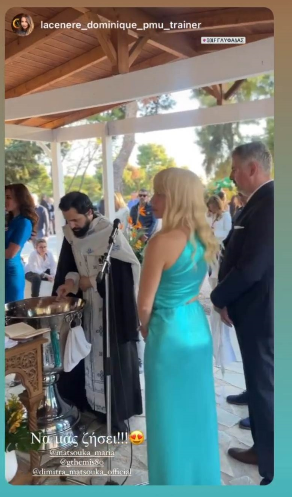 Η τελετή έγινε σε στενό οικογενειακό και φιλικό κύκλο, ενώ οι καλεσμένοι ανέβασαν στιγμιότυπα και βίντεο στα social media, τα οποία έκανε repost η Μαρία Ματσούκα.