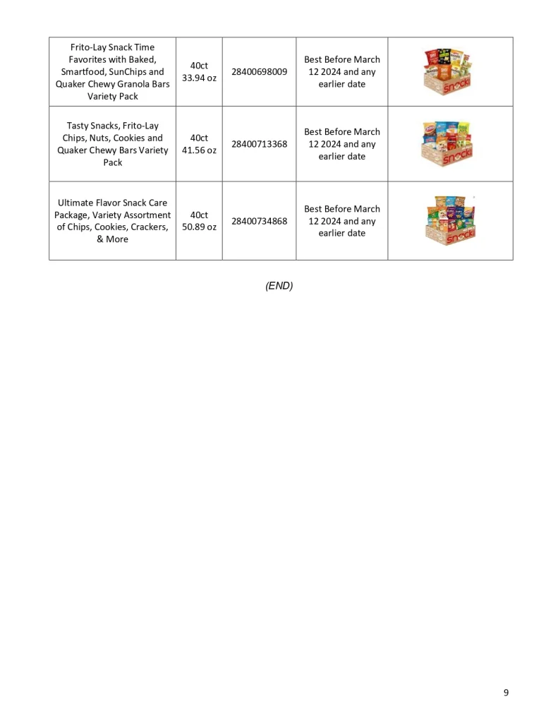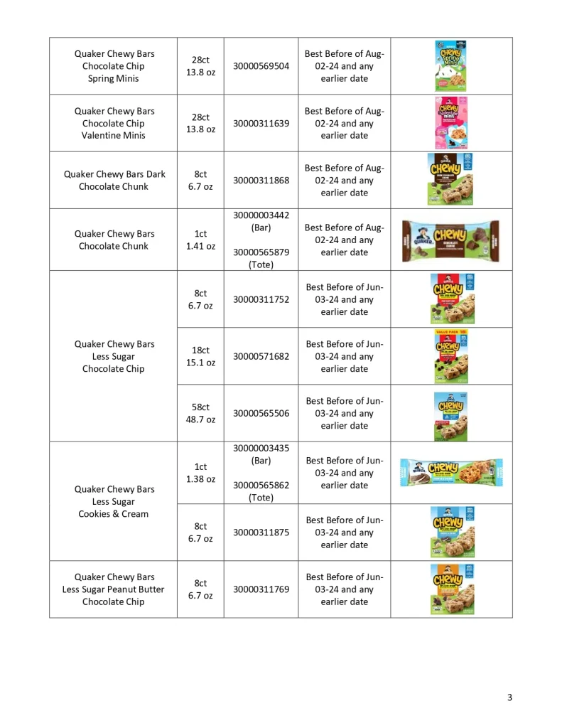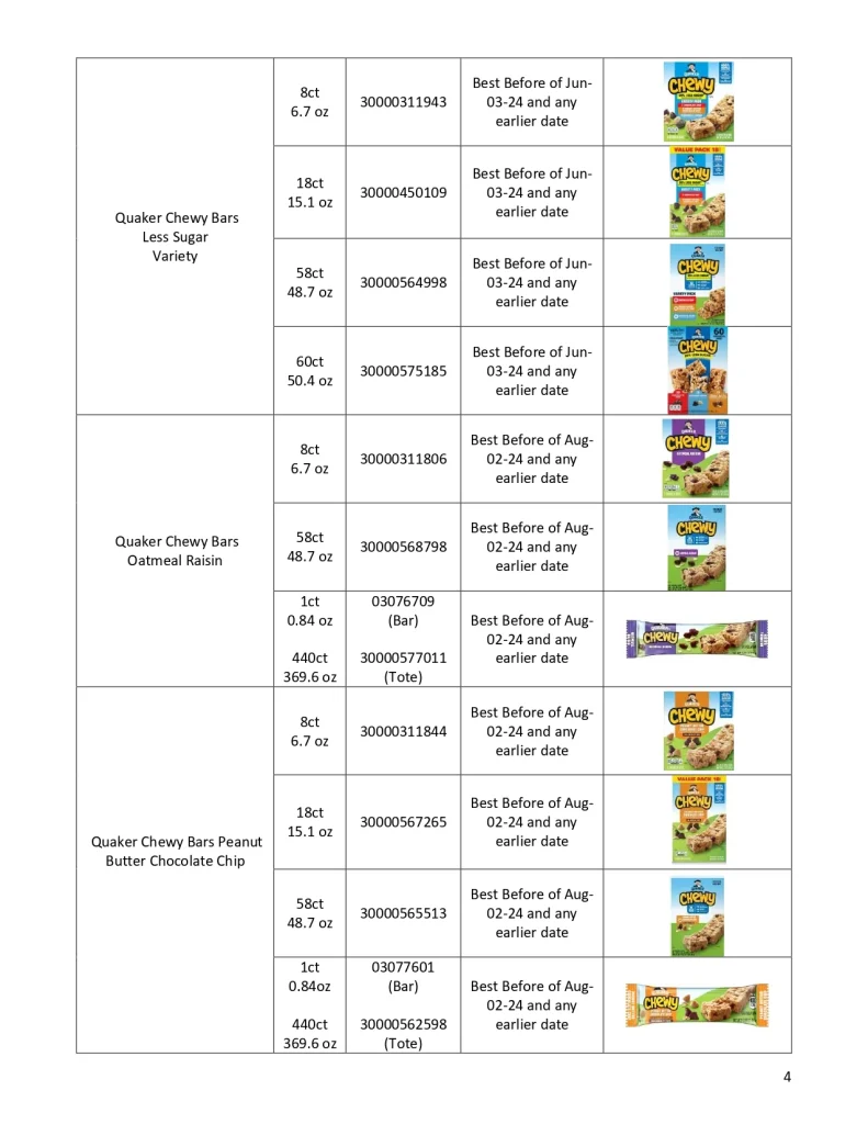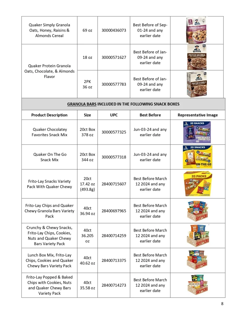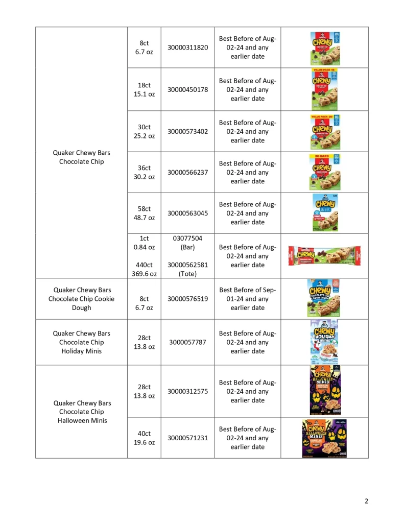 Η ανάκληση του Lidl περιλαμβάνει συγκεκριμένα είδη granola επώνυμα Quaker, από τα οποία η Lidl έχει πουλήσει μόνο: Quaker Chewy Bars Peanut Butter Chocolate Chip 8ct 6,7 oz, Quaker Chewy Bars Chocolate Chip 8ct 6,7oz και Quaker Chewy Bars Chocolate Chip Halloween .328ct Min.1. Η Lidl και άλλα καταστήματα απευθύνονται σε πελάτες που έχουν εντοπιστεί ότι έχουν αγοράσει τα προϊόντα που ανακαλούνται.