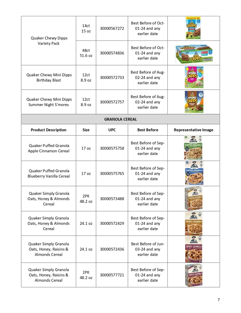 Η Quaker, δήλωσε ότι δεν έχει λάβει επιβεβαιωμένες αναφορές για άτομα που αρρώστησαν μετά την κατανάλωση των ανακληθέντων προϊόντων.