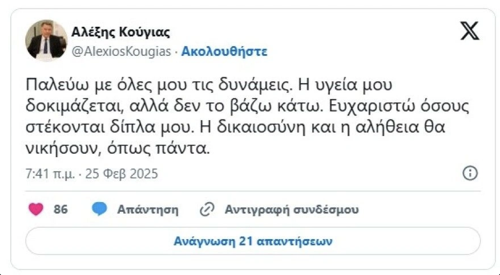 «Σχετικά με τα δημοσιεύματα που αφορούν δήθεν αναρτήσεις του πατέρα μου, οφείλω να δηλώσω ότι ο πατέρας μου δεν διατηρεί κανέναν λογαριασμό στα social media, οπότε οτιδήποτε διαρρέει είναι ψεύτικο. Ελπίζω να μη συνεχίσει να λαμβάνεται υπόψη από τα Μέσα», ανέφερε στην ανακοίνωσή του ο Χρήστος Κούγιας.