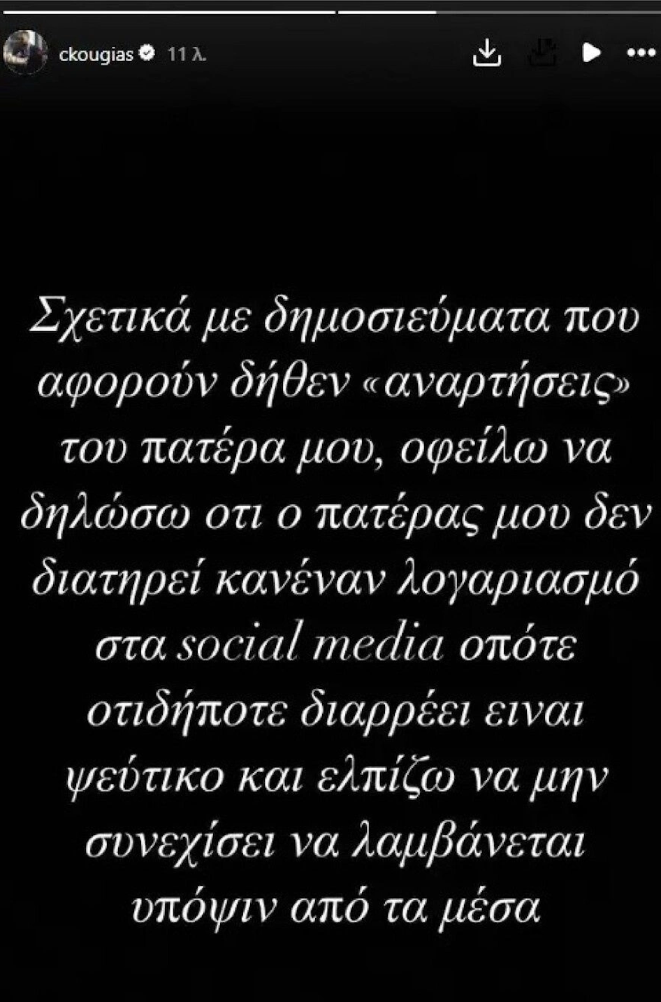Με ανάρτησή του, ο 23χρονος Χρήστος Κούγιας τόνισε πως ο πατέρας του δεν διατηρεί κανέναν λογαριασμό στα social media. Παράλληλα, ζήτησε από τα Μέσα Ενημέρωσης να μην λαμβάνουν υπόψη τους ψεύτικους λογαριασμούς που κυκλοφορούν στο διαδίκτυο.