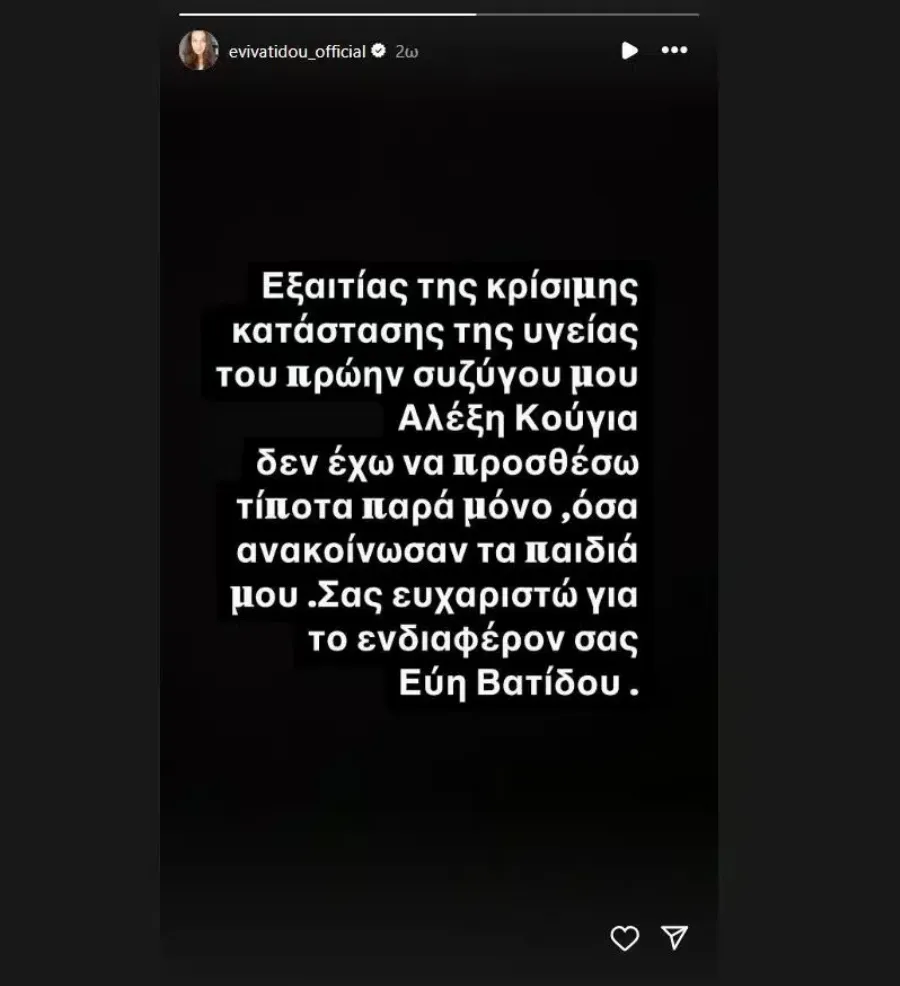 Λίγες ώρες μετά την ανάρτηση των παιδιών της, η πρώην σύζυγος του Αλέξη Κούγια, Εύη Βατίδου προχώρησε με την σειρά της σε μια ανακοίνωση την οποία εξέδωσε μέσω του προσωπικού της λογαριασμού στο Instagram και ευχαρίστησε τον κόσμο για το ενδιαφέρον του.