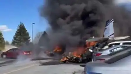 Σοκαριστικά πλάνα από το σημείο καταγράφουν το αεροσκάφος να έχει μετατραπεί σε μια πύρινη μάζα στο πάρκινγκ, από τη φωτιά που ξέσπασε, με μαύρο καπνό να υψώνεται στον ουρανό.