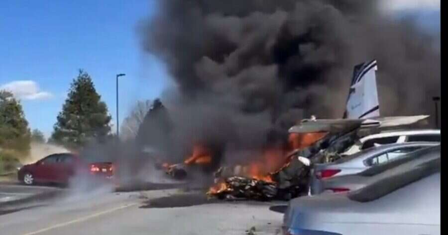 Τα απανθρακωμένα υπολείμματα πολλών οχημάτων φαίνονται στο βίντεο, ενώ η ουρά του αεροσκάφους –ένα Beechcraft A36TC- είναι τυλιγμένη στις φλόγες απέναντι από ένα γηροκομείο της περιοχής.