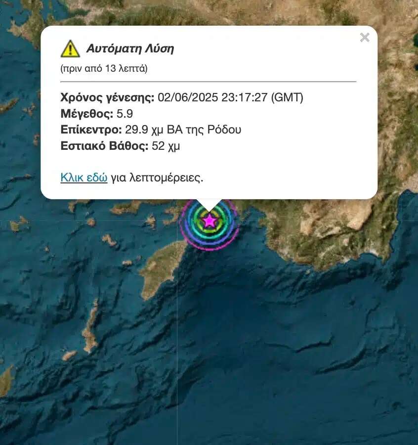 Ισχυρός σεισμός 5,9 ρίχτερ ταρακούνησε τα ξημερώματα τη Ρόδο