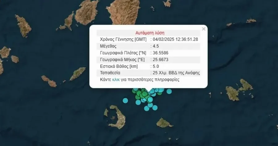 Νέα ισχυρή σεισμική δόνηση σημειώθηκε ανοιχτά της Αμοργού και της Σαντορίνης, αυτή τη φορά αγγίζοντας τους 5 βαθμούς της κλίμακας Ρίχτερ όπως αρχικά ανακοινώθηκε από το Γεωδυναμικό Ινστιτούτο.
