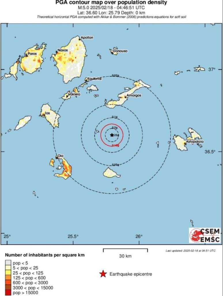 Το ακριβές επίκεντρο τη δόνησης εντοπίζεται στα 39 χλμ. βορειοανατολικά από την Οία.