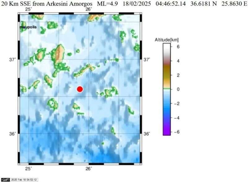 H αυτόματη λύση του Γεωδυναμικού Ινστιτούτου του Αστεροσκοπείου Αθηνών δίνει το σεισμό στα 4,9 Ρίχτερ, με εστιακό βάθος στα 5 χλμ., και επίκεντρο τα 20 χλμ. νότια – νοτιοδυτικά της Αρκεσίνης Αμοργού.