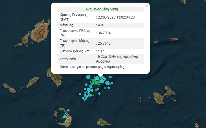 Σύμφωνα με το Γεωδυναμικό Ινστιτούτο του Εθνικού Αστεροσκοπείου Αθηνών, το επίκεντρο της δόνησης εντοπίζεται στον θαλάσσιο χώρο 9 χλμ. νοτιοδυτικά της Αρκεσίνης Αμοργού, με το εστιακό βάθος να εκτιμάται στα 13χλμ.