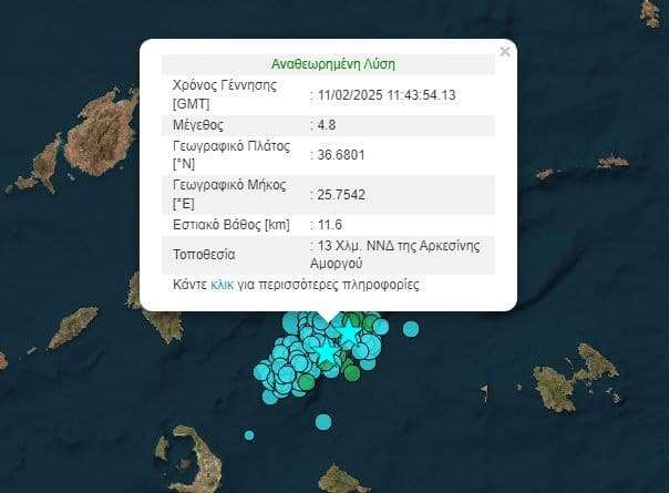 Νέα σεισμική δόνηση 4,8 βαθμών της κλίμακας Ρίχτερ σημειώθηκε στις 13.43 13 χλμ. νότια νοτιοδυτικά της Αρκεσίνης Αμοργού.