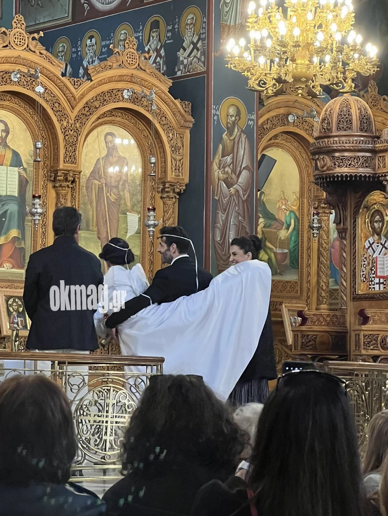 Ο γαμπρός έφτασε στην εκκλησία κρατώντας μια ανθοδέσμη με τριαντάφυλλα ενώ η νύφη έφθασε λίγο αργότερα με ένα υπέροχο νυφικό σε ρομαντικό στιλ, συνοδευόμενη από τον γιο τους.