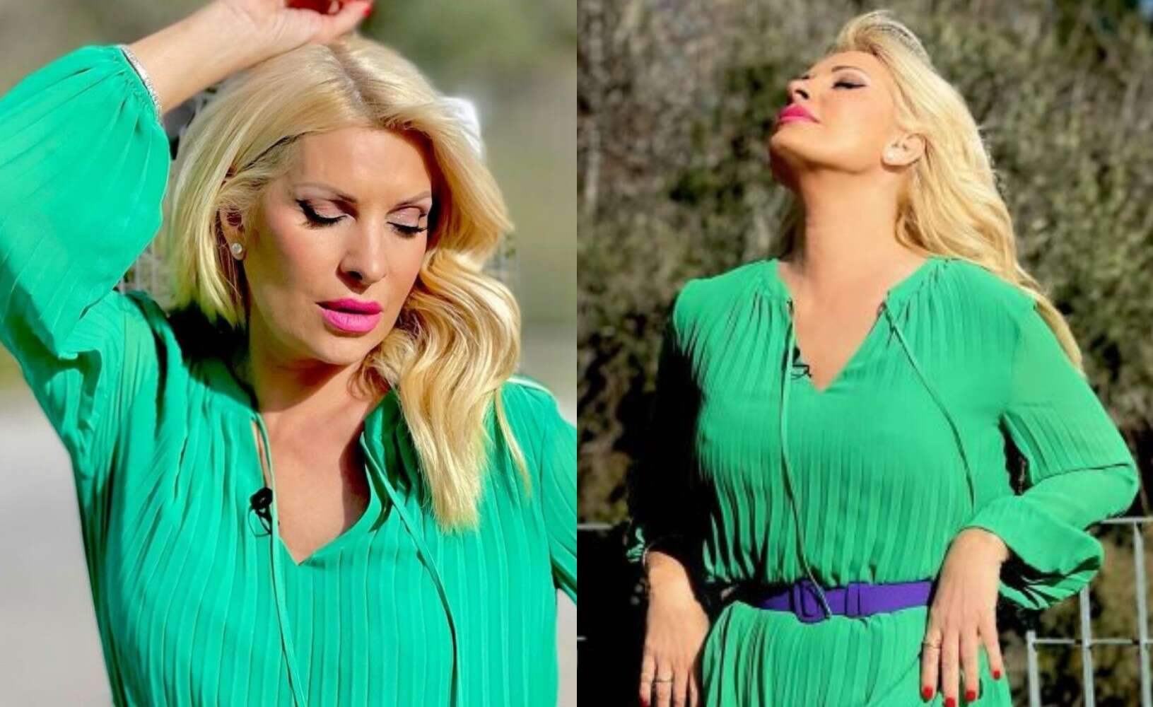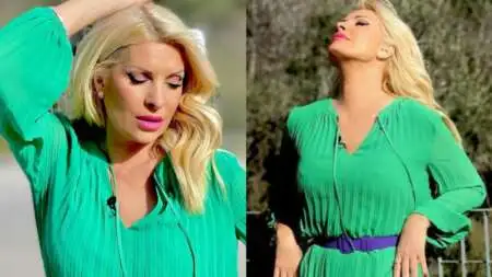 Φαίνεται πως τα έντονα χρώματα είναι η τάση για την άνοιξη του 2024, και η γνωστή παρουσιάστρια ακολούθησε αυτήν την τάση επιλέγοντας ένα πλισέ μίντι φόρεμα σε πράσινο. Με τη σύνδεση μιας μωβ λεπτής ζώνης και πράσινων πέδιλων που δένουν στον αστράγαλο, ανέδειξε την εμφάνισή της.
