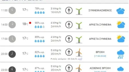 Ανεμοι: Από νότιες διευθύνσεις 3 με 5 και στα ανατολικά και τα νότια 6 πρόσκαιρα τοπικά 7 μποφόρ.