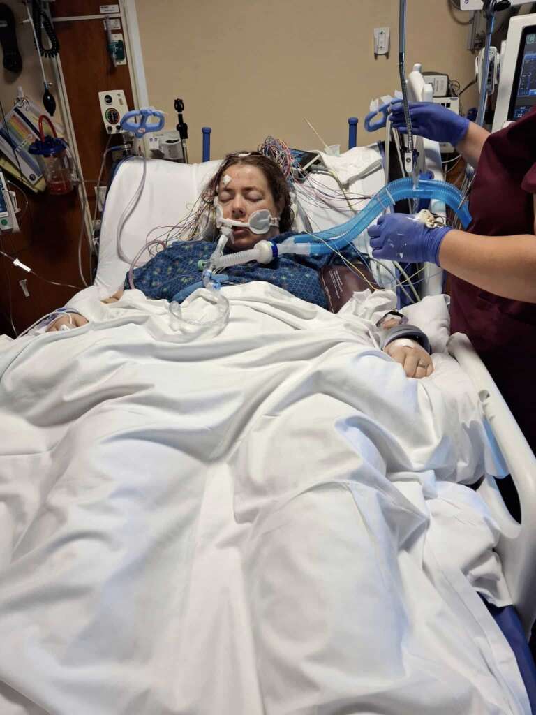 Η 32χρονη διακομίστηκε στο νοσοκομείο και οι γιατροί διαπίστωσαν ότι ο ένας πνεύμονας καταστράφηκε, ενώ ο άλλος είχε σχεδόν καταρρεύσει. Αμέσως, τη διασωλήνωσαν και αφαίρεσαν δύο λίτρα μαύρου υγρού από τους πνεύμονες της, ενώ την έθεσαν σε τεχνητό κώμα για 11 μέρες.