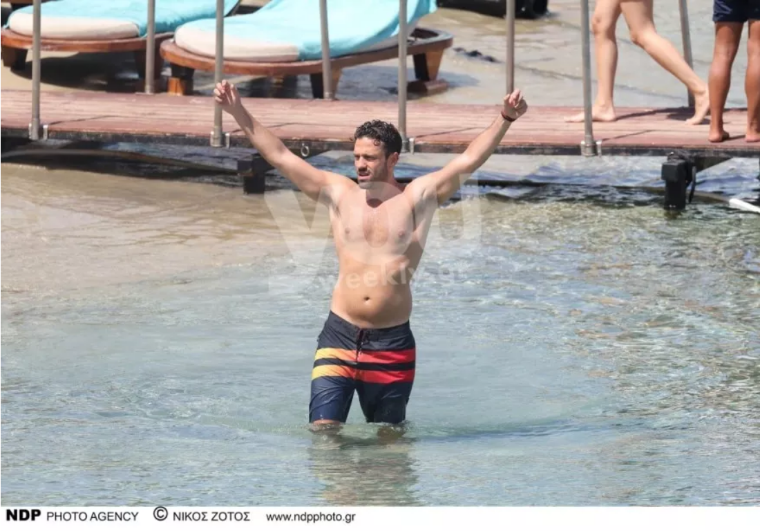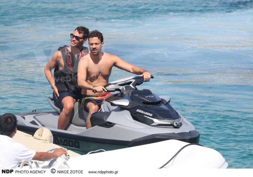 Ο φωτογραφικός φακός λοιπόν, τον “τσάκωσε” πολύ πρόσφατα στη Μύκονο μαζί με τον φίλο του, Ανέστη Ευαγγελόπουλο, με τον τραγουδιστή να φορά το σκούρο μπλε μαγιό του με τις πορτοκαλοκόκκινες λεπτομέρειες, κρατώντας τον καφέ του και πανηγυρίζοντας μπροστά στον κόσμο, ενώ λίγο αργότερα ανέβηκε στο τζετ σκι για μία βόλτα.